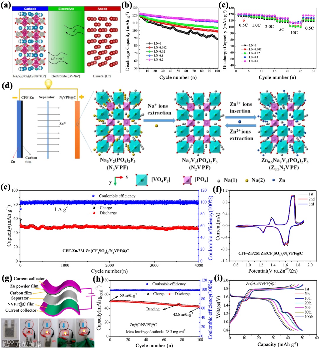 图十:(a) NVPF在锂离子电池中的结构示意图;NVPF@C@PTHF在锂离子电池中的 (b)循环稳定性和 (c) 倍率性能;(d) NVPF在锌离子电池中的结构示意图和储锌机理图;CFF-Zn//NVPF@C电池的 (e) 循环性能和 (f) CV曲线;Zn@C/NVPF@C电池的 (g) 结构示意图,(h) 循环性能和 (i) 相应的充放电曲线。