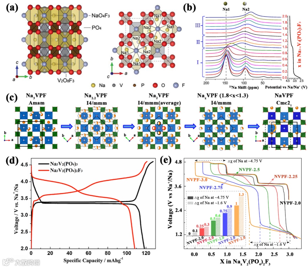 NVPF结构中有两种Na位点,占据比为2:1。其中被完全占据的Na位点记为Na1,其余只被部分占据的Na位点记为Na2。Na+从NVPF中脱出的过程伴随着一系列非常复杂的相变。一般来说,NVPF中只有两个Na+能参与反应,第三个Na+很难进行脱嵌。为了激发第三个Na+的电化学活性,将形成一个新的无序的"NVPF"相。