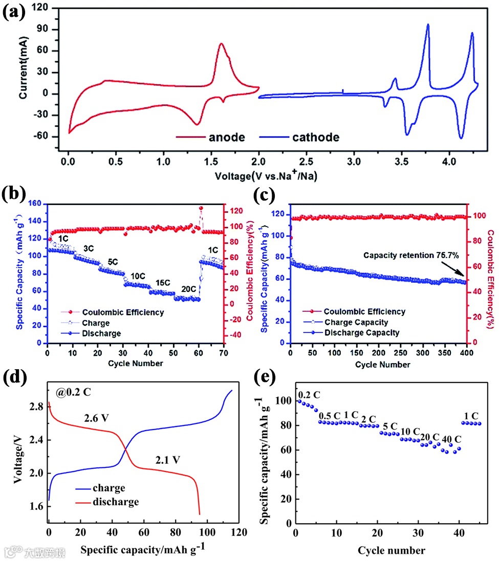 图七:(a) NVPF@C@rGO作为阴极和阳极的循环伏安曲线 (CV);NVPF@C@rGO对称电池的 (b) 倍率性能和在10 C下的 (c) 循环性能;NVPF--NVP全电池的 (d) 恒电流充放电曲线和 (e) 倍率性能。