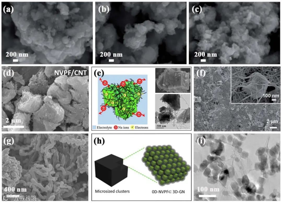 图三:(a) NVPFC-1,(b) NVPFC-2和(c) NVPFC-3的SEM图;(d) NVPF/CNT的SEM图;(e) NVPF@C/CNTs复合材料电子和离子迁移及形貌图;(f) NVPF-SWCNT,(g) NVPF@C@CNF的SEM图;(h) NVPF@GN复合材料示意图;(i) NVPF@GN的TEM图。