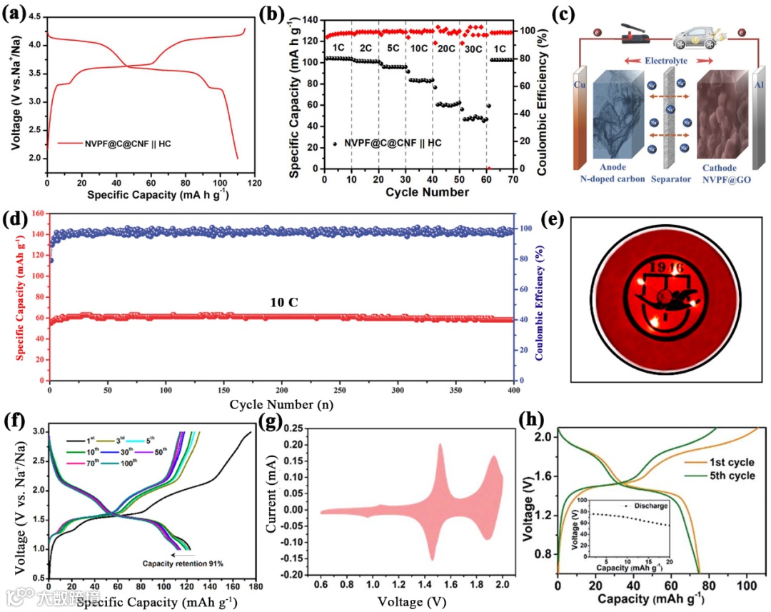 图八:NVPF@C@CNF//HC全电池的 (a) 充放电曲线和不同电流密度下的 (b) 倍率性能;N掺杂碳//NVPF@rGO全电池的 (c) 结构示意图,10 C下的 (d) 长循环性能以及 (e) 点亮的LED灯泡;(f) NTP@C//NVPF@CD全电池在1 C下、1.0-3.0 V电压范围内的充放电曲线;NVPF-SWCNT//NTP-MWCNT水系全电池的 (g) CV曲线和 (h) 充放电曲线。