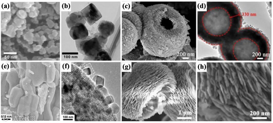 图六:NVPF/C的 (a) FE-SEM和 (b) FE-TEM图;(c) NVPF的SEM图;(d) NVMPF@C的HRTEM图;NVPF@CD的 (e) SEM图和 (f) HRTEM图;(g-h) NVPF纳米花在不同放大倍率下的SEM图。