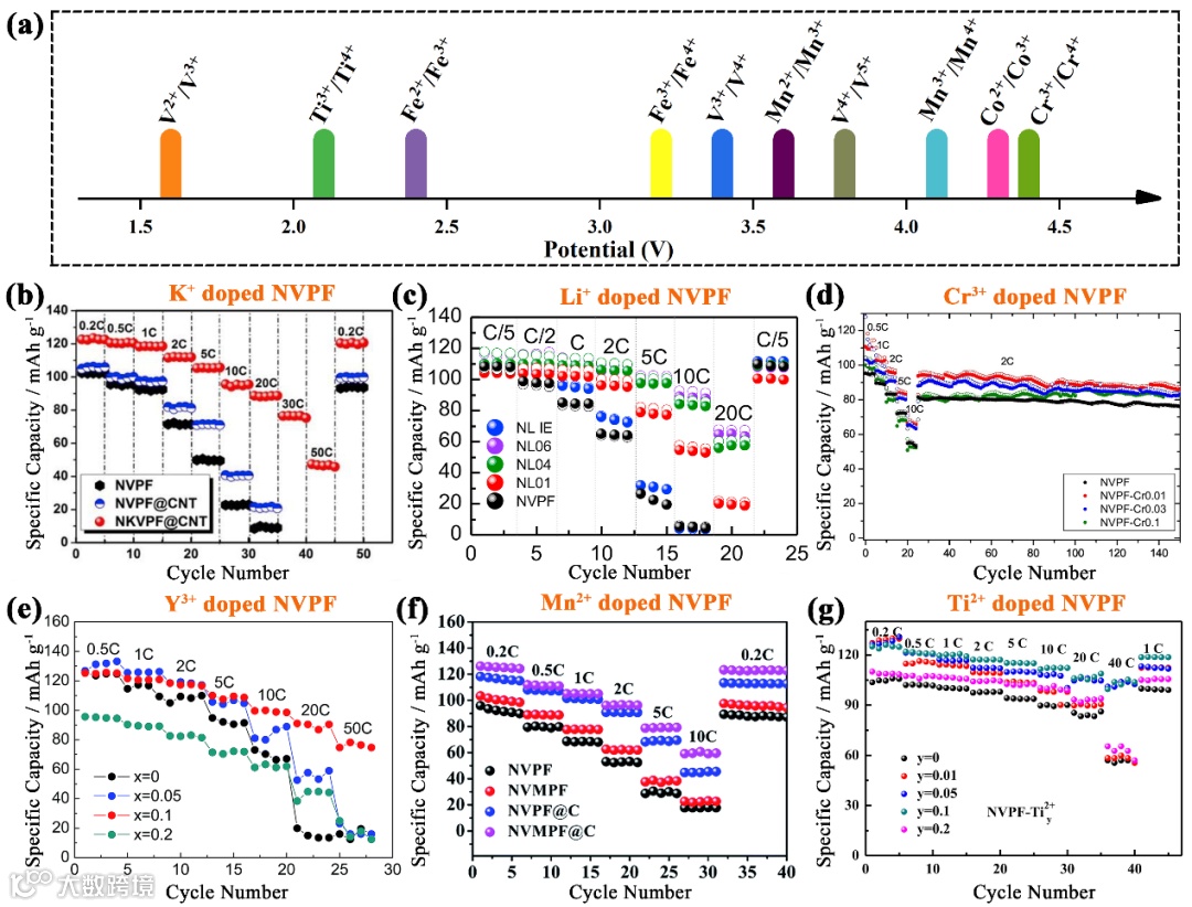 图五:(a) 常见过渡金属元素的氧化还原电位;(b) K+,(c) Li+,(d) Cr3+,(e) Y3+,(f) Mn2+,(g) Ti2+掺杂的NVPF的倍率性能。