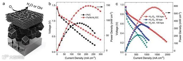 图4. (a) Fe/Ni-Nx/OC阴极的锌-空气电池和PEMFC的示意图;(b) Fe/Ni-Nx/OC和Pt/C为阴极的锌-空气电池的放电极化曲线和相应的功率密度图;(c) 以H2/O2和H2/空气为燃料,Fe/Ni-Nx/OC为阴极的PEMFC的放电极化曲线和相应的功率密度图。