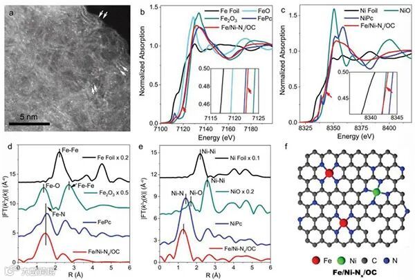 图2. (a) Fe/Ni-Nx/OC的HAADF-STEM图像;(b) Fe K-edge XANES光谱和(c) Ni K-edge XANES光谱;(d) Fe/Ni-Nx/OC, Fe金属箔, Fe2O3和FePc在Fe K-edge和 (e) Fe/Ni-Nx/OC, Ni箔, NiO和NiPc在Ni K-edge的傅里叶转换EXAFS光谱;(f) Fe/Ni-Nx/OC的预测结构模型。