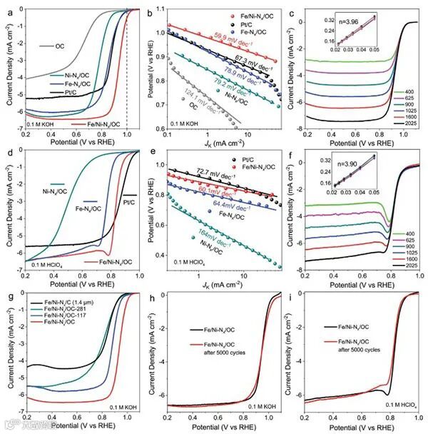 图3.(a) Fe/Ni-Nx/OC、Fe-Nx/OC、Ni-Nx/OC、OC和Pt/C在O2饱和0.1 M KOH中的ORR极化曲线,旋转速率为1600 rpm,(b) 相应的Tafel图;(c) Fe/Ni-Nx/OC在0.1 M KOH中的ORR极化曲线,插图为相应的K-L图;(d) Fe/Ni-Nx/OC、Fe-Nx/OC、Ni-Nx/OC和Pt/C在O2饱和0.1 M HClO4中的ORR极化曲线,旋转速率为1600 rpm,(e) 相应的Tafel图;(f) Fe/Ni-Nx/OC在0.1 M HClO4中,在不同的旋转速率下的ORR极化曲线与相应的K-L图;(g) Fe/Ni-Nx/OC、Fe/Ni-Nx/C (1.4 µm)、Fe/Ni-Nx/OC-117和Fe/Ni- Nx/OC-281在O2饱和0.1 M KOH中的ORR极化曲线,旋转速率为1600 rpm;(h,i) Fe/Ni-Nx/OC在O2饱和0.1 M KOH (h) 和0.1 M HClO4 (i) 中5000次循环前后的ORR极化曲线,旋转速率为1600 rpm。