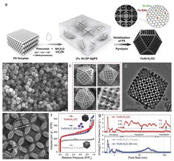图1a表明了Fe/Ni-Nx/OC的合成过程。简单地说,将预先合成的聚苯乙烯球 (PSs,直径270 nm) 首先组装成三维有序的PS模板。然后通过浸渍Fe3+、Ni2+及2-甲基咪唑在PS模板上形成ZIF-8 (ZIF=沸石咪唑骨架) (表示为(Fe,Ni)-ZiF-8@PS)。将得到的 (Fe,Ni)-ZiF-8@PS经过热解分解PSs,并碳化ZIF-8,同时将Fe和Ni锚定到形成的碳载体上,形成均匀尺寸的Fe/Ni-Nx/OC,平均尺寸为1.6 µm(图1b)。作者通过扫描电子显微镜(SEM)、透射电镜(TEM)和高角度环形暗场扫描透射电子显微镜 (HAADF-STEM)对Fe/Ni-Nx/OC (图1c-e)进行了表征,结果表明其是由30-60 nm介孔通道相互连接的三维大孔 (≈180 nm) 立体结构。用N2吸附-解吸等温线 (图1f,g) 进一步分析了其孔隙结构特征,BET比表面积为800.9 m2g-1,表面比表面积为289.7 m2g-1。这些结果揭示了Fe/Ni-NX/OC独特的三维多孔结构。