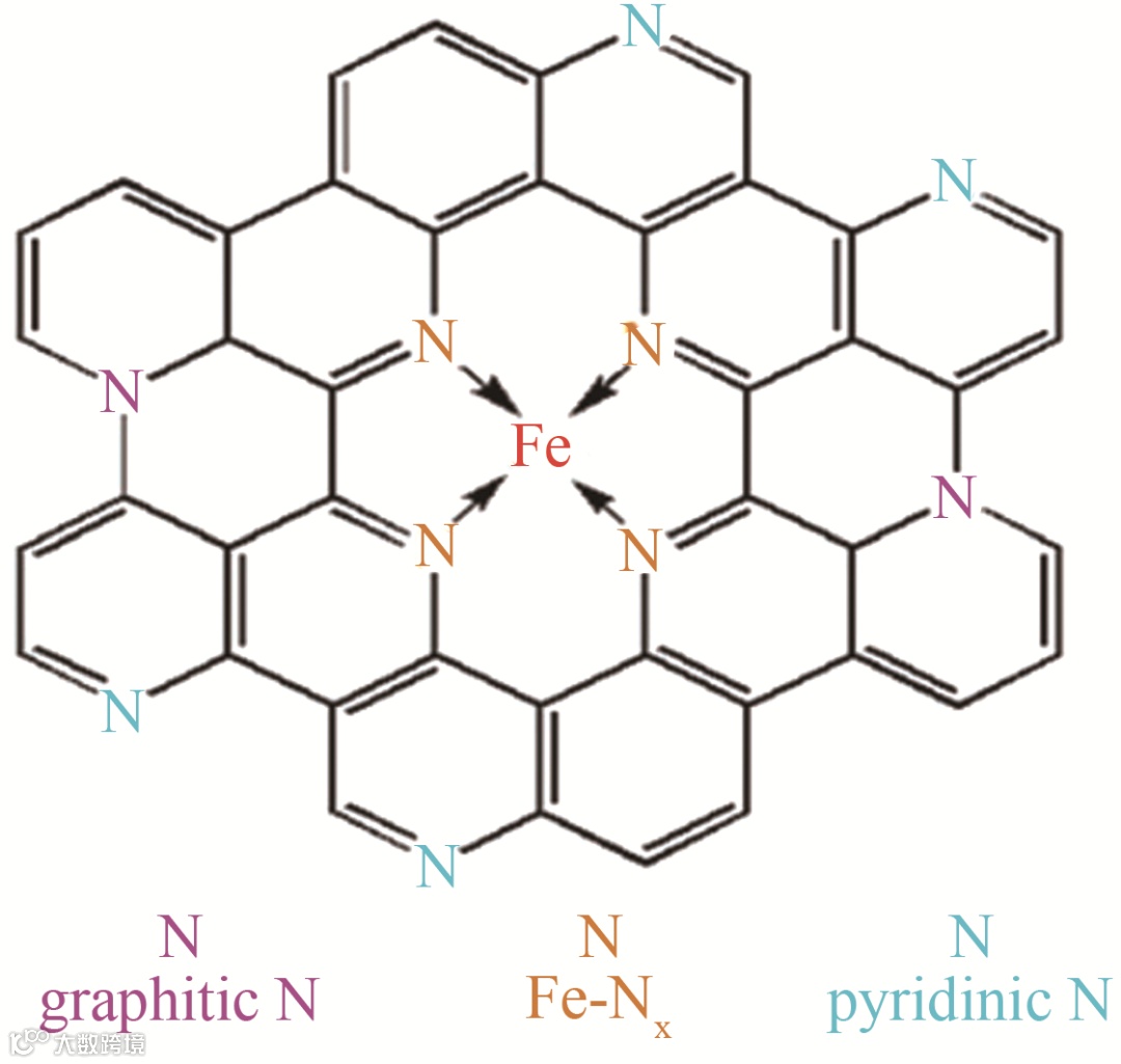 碳材料具有成本低、稳定性好、比表面积大和导电率高等显著优点,其作为催化剂载体或非贵金属催化剂受到广泛关注[4]。在氧气的电化学催化中,氧气可以在碳材料表面发生吸附和还原,但碳材料表面的氧还原反应是以产生过氧化物的二电子途径进行,往往需要很高的过电位,不利于能量利用效率的提高。为了改善碳材料的氧还原性能,可以通过非金属杂原子(N、S、P、B)掺杂或结构调整来提高催化活性。Dai等首次发现非金属碳材料是有效的ORR电催化剂,研究表明在碳纳米管中掺杂氮改变了氧气的化学吸附模式,促进四电子反应进行,这可以有效地削弱或破坏氧氧键,显著提高了ORR催化活性。掺杂在碳材料中的氮以吡啶型氮、吡咯型氮和石墨型氮的形式存在,通过改变氮源、调整温度和合成方法可以得到不同比例的3种形式,但是目前对影响催化活性的氮的形式还没有具体的定论。