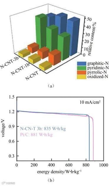 Yang等通过热解三聚氰胺和L-半胱氨酸混合物,控制碳化温度,制备出了高活性的氮掺杂三维石墨烯纳米带网络(N-GRW),在锌空气电池中的开路电压为1.46 V,峰值功率密度和比容量分别为65 mW/cm2和873 mA·h/g,具有良好的循环稳定性,分析认为吡啶氮结构起主要催化作用。为了提高吡啶氮的含量,Yi等利用高锰酸钾刻蚀空心管型聚吡咯制备了氮掺杂碳纳米管,通过刻蚀碳材料引入了丰富孔结构和缺陷,使得更多N原子处在边缘位置,吡啶氮的含量由32.8%提升到了45.2%[图1(a)],该催化剂在碱性条件下具有优于商业Pt/C的半波电位(0.83 V)和稳定性,应用于锌空气电池中,显示出122 mW/cm2的峰值功率密度和835 W·h/kg的能量密度[图1(b)],与商业Pt/C近似。