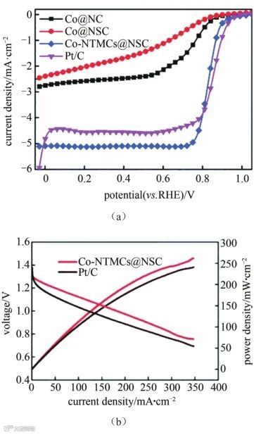 过渡金属本身具有高催化活性,但抗氧化性能差。研究发现,过渡金属颗粒和碳材料复合作为ORR和OER双功能催化剂表现出强的催化性能。在这种复合结构中,过渡金属可以增加碳化过程中碳材料的石墨化程度,包裹在表面的碳材料可以有效的防止金属团聚以确保分散,同时可以促进电子的转移。Zhu等通过功能聚合物的可控自组装制备了钴掺杂含氮和硫的多孔碳球(Co-NTMCs@NSC),Co原子均匀分布在碳球表面,提高了材料本征催化活性。测试显示ORR半波电位为0.833V[图2(a)],在碱性介质中具有良好的耐甲醇能力和长期的耐用性。此外,它还表现出高效的OER催化活性,在10 mA/cm2下具有284 mV的过电位。用作可充电锌空气电池的空气阴极时,在充放电循环的12 h内显示出高的峰值功率密度262 mW/cm2[图2(b)]和小的充放电电压间隙,优于Pt/C基空气阴极。Ma等同样采用高温热解聚合物法制备了碳纳米管包覆合金纳米粒子催化剂,作为锌空气电池空气阴极催化剂时显著地提高了电池的循环稳定性,并表现出高的峰值功率密度。