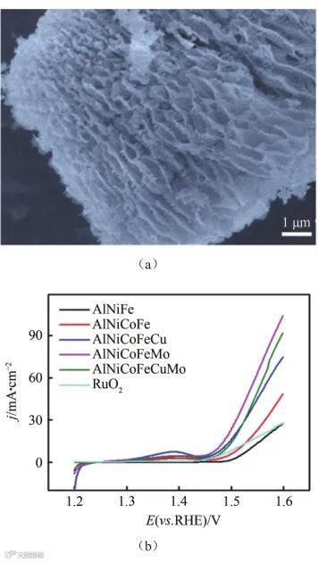 图3 (a) np-AlNiCoFeMo合金的SEM图;(b) 不同合金的LSV曲线图