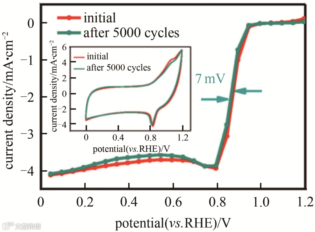 图6 Co@hNCTs-800经过5000次循环后的LSV和CV曲线