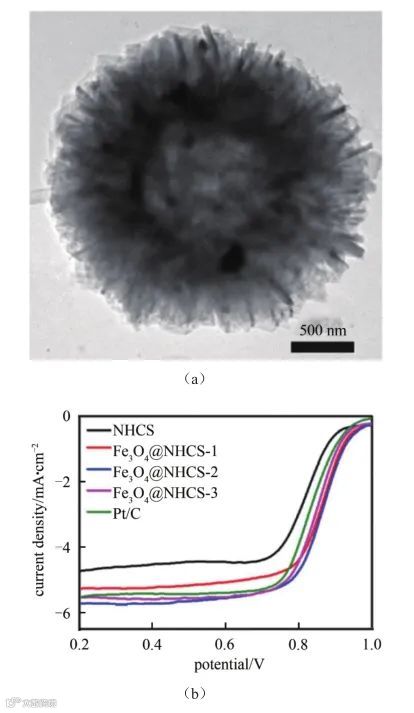 图4 (a) Fe3O4@NHCS的TEM图;(b) ORR极化曲线图