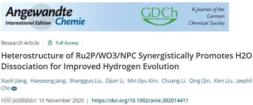 近日,青岛科技大学Qing Qin,刘希恩,蔚山国家科学技术研究所Jaephil Cho教授等在国际期刊ANGEWANDTE CHEMIE-INTERNATIONAL EDITION上发表题为“Heterostructure of Ru2P/WO3/NPC Synergistically Promotes H2O Dissociation for Improved Hydrogen Evolution”的研究工作。
