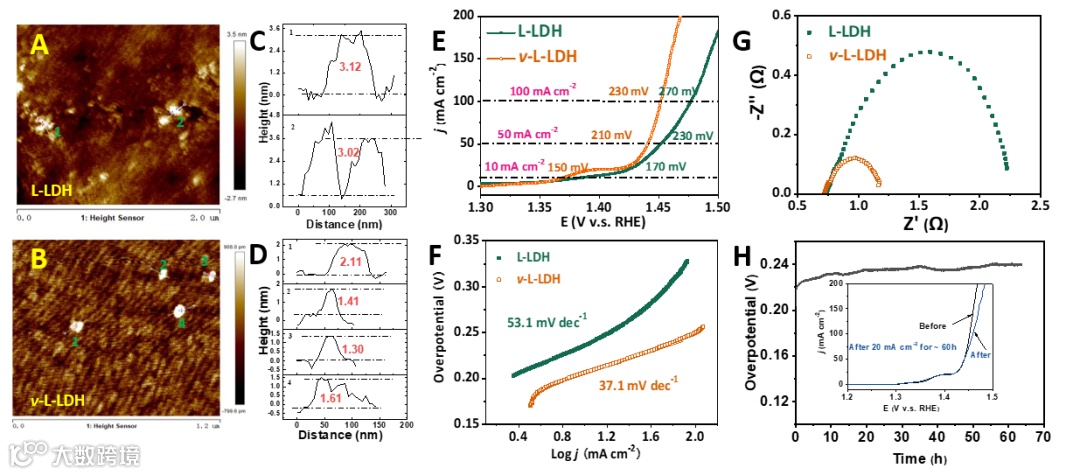 图4. 薄层NiFe LDH催化剂的表征。(A) 薄层NiFe LDH (L-LDH)和(B) L-LDH (v-L-LDH)的AFM高度分布;(C和D)对应于A的1-2廓线和B的1-4廓线的高度图;(E) L-LDH和v-L-LDH的线性扫描伏安图(LSV)曲线;(F) L-LDH和v-L-LDH的Tafel图;(G) L-LDH、v-L-LDH过电位为250 mV时的电化学阻抗谱(EIS);(H) 20 mA cm−2时v-L-LDH计时电位曲线;插图:CP试验前(黑色)和后(蓝色)的LSV曲线。