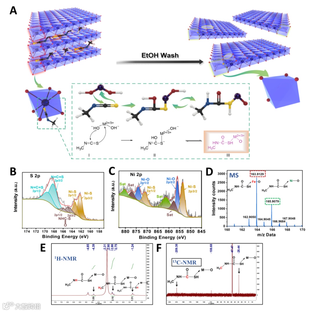 图1. 金属氧多重空位NiFe LDH材料的设计。(A)以特定原子为靶标产生多原子的机制。结构特征:(B) S 2p和(C) Ni 2p区域的高分辨率XPS谱。(D) CH3NCS靶向NiFe LDH后乙醇洗涤浆液的质谱(MS)。(E) 1H-NMR和(F) 13C-NMR谱。