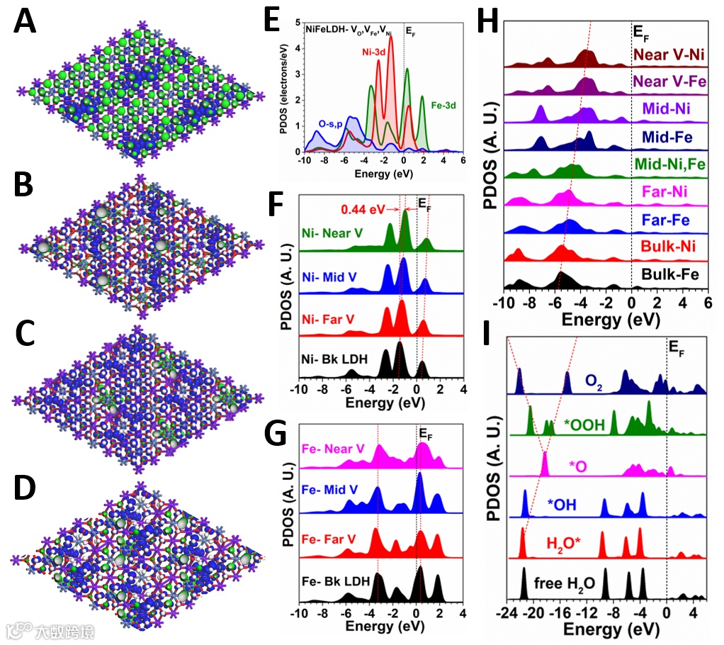 图2.缺陷镍铁LDH的电子结构。(A)含O空位的NiFe LDH的键合和反键费米能级附近的三维等值线图。(B)具有铁空位的NiFe LDH。(C)镍空位NiFe LDH。(D)具有Ni、Fe和O空位的NiFe LDH。(E)含Ni、Fe和O空位的NiFe LDH的PDOSs。(F) Ni-3d轨道位置依赖的PDOSs。(G) Fe-3d轨道位置依赖的PDOSs。(H) O-2p轨道位置依赖的PDOSs。(I) OER中间产物的PDOSs。
