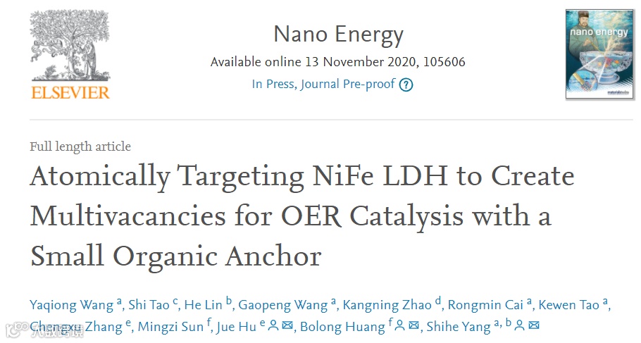近日,来自北京大学深圳研究生院广东省纳米微材料研究重点实验室的杨世和教授与昆明理工大学理学院胡觉教授,香港理工大学应用生物及化学科技学院黄勃龙教授合作,在国际知名期刊Nano Energy(影响因子:16.602)上发表题为“Atomically Targeting NiFe LDH to Create Multivacancies for OER Catalysis with a Small Organic Anchor”的观点文章。
