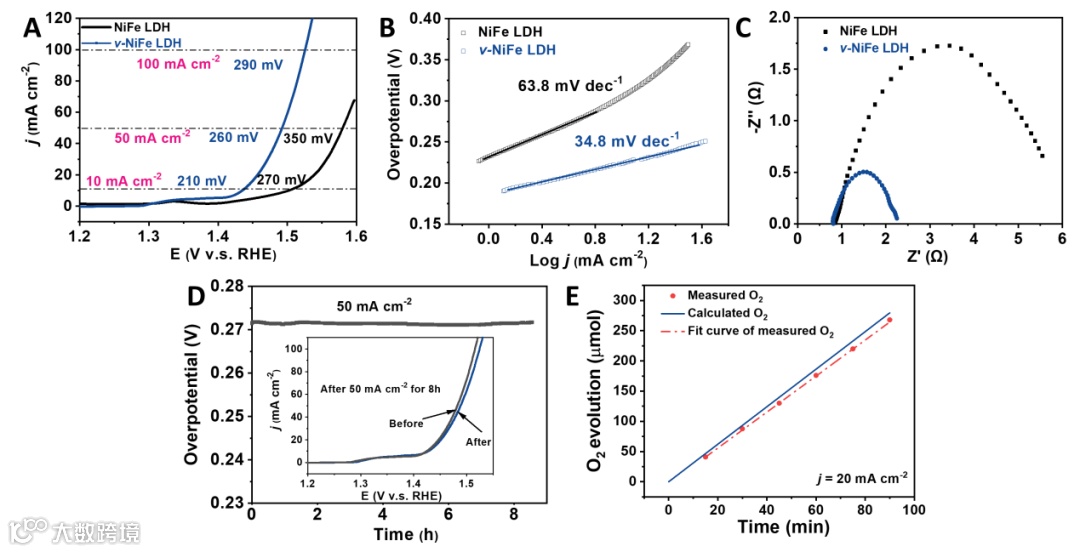 图3.催化剂的电催化性能表征。(A) NiFe LDH和v-NiFe LDH的线性扫描伏安图(LSV)曲线,(B) Tafel图,(C)过电位为250 mV时的电化学阻抗谱(EIS), (D) v-NiFe LDH在50 mA cm−2时的时电位测定(CP)曲线; 插图: 50 mA cm−2 8h前后的LSV曲线(黑色)和(蓝色),(E)理论和实验测试了v-NiFe LDH产氧的法拉第效率。
