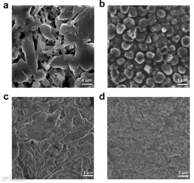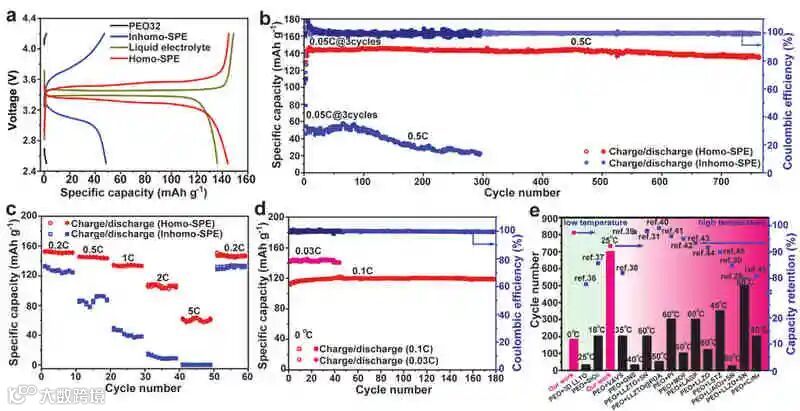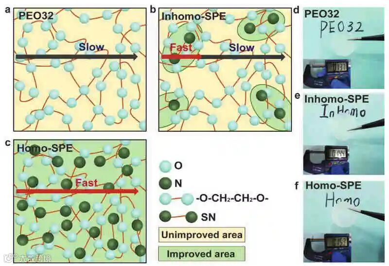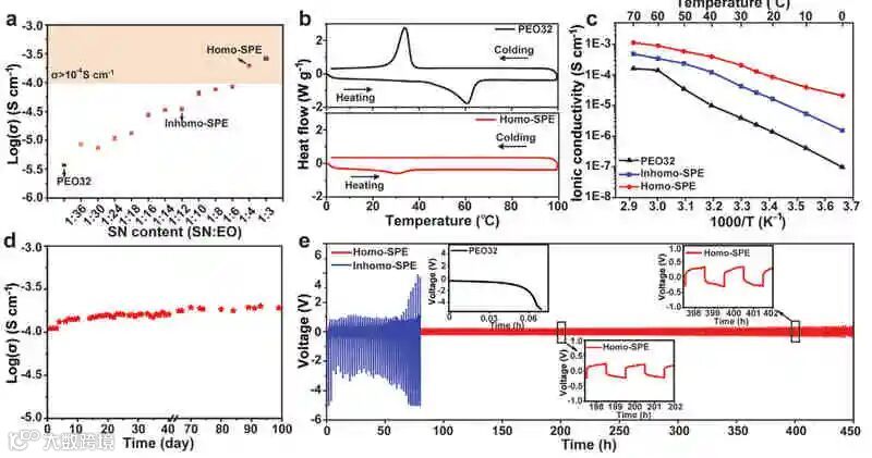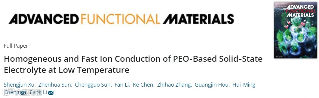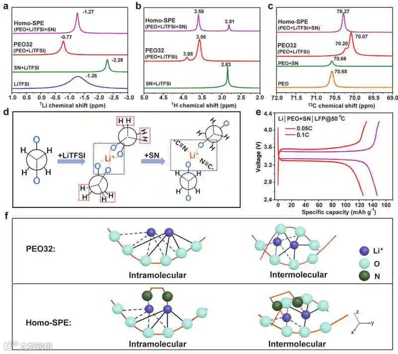 成果简介聚环氧乙烷(PEO)电解质是一种很有前景的全固态电池电解质,但由于PEO的高度结晶性和环氧乙烷(EO)链与锂离子的亲和性,只能在室温以上使用。近日,中国科学院成会明院士(共同通讯)和李峰教授(共同通讯)在材料研究顶级期刊Adv. Funct. Mater.上发表了题为” Homogeneous and Fast Ion Conduction of PEO-Based Solid-State Electrolyte at Low Temperature”的研究性论文。作者提出了一种基于均匀灵感的PEO基快离子导电固体电解质的设计方案。调节丁二腈(SN)和PEO摩尔比的PEO基均相固体电解质同时抑制了PEO的结晶,降低了EO与Li+之间的亲和力。通过调整SN与PEO的摩尔比(SN:EO≈1:4),在均匀的固态聚合物电解质中形成了提供快速Li+传输的通道,使离子电导率提高了100倍,并使其能够在低温(0-25°C)下应用,同时实现了均匀的锂沉积。这种改性的PEO基电解质还可以使LiFePO4正极在室温下获得更高的库仑效率(>99%)和长寿命(>750次循环)。此外,即使在0°C的低温下,其室温容量也保持了82%,显示了该电解质在实际固态锂电池应用中的巨大潜力。图文导读PEO基电解质示意图具有快速Li+传输通道的均相PEO基固态电解质的示意图如上图。图a显示了典型的PEO基固态电解质(PEO32)。由于其高度的结晶度和环氧乙烷链对Li+的亲和力,它具有较低的离子电导率。为了在固态聚合物电解质中形成均匀、快速的离子通道,选择SN是因为其分子尺寸中Li+结合位点的距离相匹配。当在PEO基固体电解质中加入10 wt%的SN(SN:EO=1:12)时,如图b所示,产生了不均匀的固态聚合物电解质(Inhomo-SPE),其中形成了不均匀的相和不连续的Li+通道,严重限制了Li+的传输。为了构建具有连续和快速的Li+传输通道的均相固态聚合物电解质(Homo-SPE),需要更多的SN来形成具有更大面积的混合均相(图c)。这种混合均相是指PEO和SN在Li+结合位点尺度上形成的连续复合结构,在电解液中产生连续的快速Li+传输通道。固体电解质的物理化学和电化学表征如图a所示,与典型的PEO32相比,当SN含量达到SN:EO=1:12(10 wt%SN)和1:4(≈27 wt%SN)时,PEO基电解质的离子电导率分别增加了10倍和100倍。总体而言,具有较高SN/EO比的PEO基电解质具有较高的离子电导率,这是因为形成了具有快速Li+传输通道的均匀电解质。为了研究SN对Homo-SPE结晶行为的影响,用差示扫描量热法(DSC)研究了Homo-SPE和PEO32的热转变。如图b所示,在60°C的熔化温度(Tm)下观察到与PEO32的峰,当添加27 wt%SN时,生成的Homo-SPE的Tm降至30°C。另外,从100~0℃的DSC曲线来看,PEO32的结晶温度(Tc)约为30℃,而Homo-SPE则没有结晶。图c显示,Homo-SPE在0-70°C具有最高的离子电导率,SN含量高的Homo-SPE的离子电导率增加归因于两点。首先,SN抑制了PEO的结晶,促进了PEO链的运动。其次,也是更重要的是,PEO基固体电解质中较高的SN/EO比有利于形成具有快速Li+输运通道的均匀电解质。此外,还在室温下对Homo-SPE进行了随时间变化的交流阻抗谱(EIS)测量。在3个月内获得了稳定的离子电导率,增幅可以忽略不计(图d)。结果表明,Homo-SPE具有较高的离子电导率稳定性,有利于实现循环寿命较长的全固态电池。为了评价Homo-SPE的循环稳定性,组装了以锂箔为电极的对称电池。如图e所示,在室温下用0.1 mAh cm−2测量Homo-SPE的电压曲线,观察到稳定的循环至少450 h没有内部短路。相比之下,在Li|PEO32|Li电池中,在相同条件下较难实现锂沉积(插图e),并且Li|Inhomo-SPE|Li电池表现出较差的循环稳定性。全电池性能图a显示了在0.5C电流密度下,不同电解质的电压分布。与Li|液体电解质|LiFePO4电池相比,全固态Li|Homo-SPE|LiFePO4电池具有稍大的过电位,但在室温下具有相似的放电容量和更高的库仑效率。然而,Li|PEO32|LiFePO4和Li|Inhomo-SPE|LiFePO4电池由于离子导电性差,在相同的测试条件下放电容量较低。如图b所示,对于Li|Homo-SPE|LiFePO4电池在0.5C的恒流循环性能,室温下的最高放电容量达到145.5 mAh g−1。此外,图c为电池的倍率性能。Li|Homo-SPE|LiFePO4电池在0.2C、0.5C、1C、2C和5C下的放电容量分别为152.8、145.3、134.3、105.7和61.5 mAh g−1。相比之下,Li|Inhomo-SPE|LiFePO4电池的放电容量低得多,稳定性也差得多。锂沉积形貌的表征用SEM研究了Homo-SPE对锂沉积的影响。图a和图b显示了循环后拆解的Li|1M LiPF6 EC-DEC|Cu和Li|Home-SPE|Cu电池在Cu上的锂沉积形貌。很明显,当使用液体电解质时,锂沉积不均匀,并形成枝晶(图a)。然而,对于Homo-SPE,锂沉积的形貌相当均匀,没有锂枝晶(图b)。拆卸的Li|1M LiPF6 EC/DEC|LiFePO4电池经过200次循环后,锂金属的表面是不平坦的(图c)。即使当循环次数是液体电解质电池的两倍时,由于Homo-SPE的保护,拆卸的Li|Homo-SPE|LiFePO4电池在400次循环后得到的锂金属负极形貌非常均匀(图d)。这是因为与液体电解质不同,PEO具有较低的交换电流密度和较高的表面能,促进了锂小颗粒的生长和锂成核密度的增加,从而使锂沉积更加均匀。锂离子在Homo-SPE中的输运机制为了了解锂离子在Homo-SPE中的传输机制,作者进行了固体核磁共振(NMR)实验。7Li固体核磁共振谱如图a所示,Li+化学环境的变化反映了SN/PEO与Li+的相互作用。与PEO32相比,Homo-SPE的 7Li NMR信号前移了0.50 ppm,Homo-SPE的Li共振上移场表明PEO-Li+相互作用减弱,因此SN的加入可以减轻EO与Li+之间的亲和力。总结展望总之,在这项工作中,作者展示了一种通过构建快速离子传输通道来提高PEO基固体电解质低温电化学性能的简单而有效的方法。通过加入较高含量的SN,形成