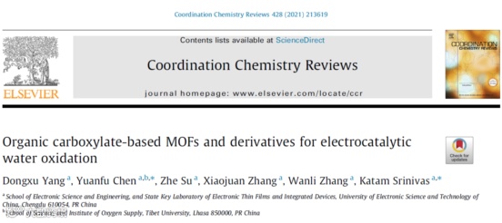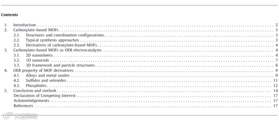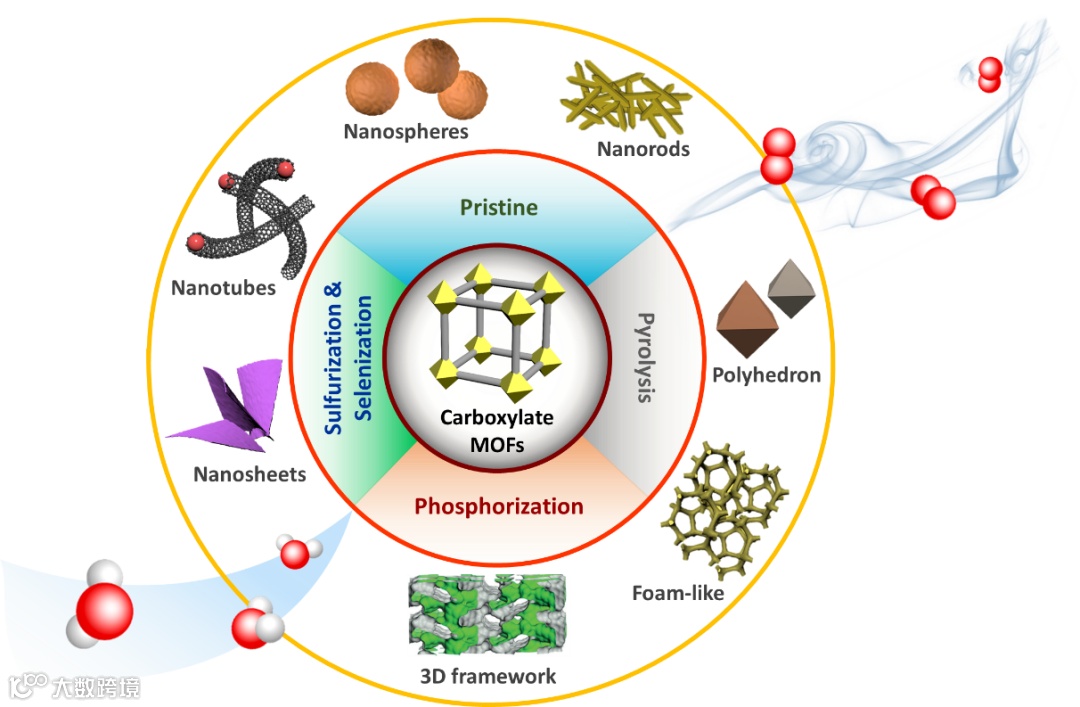 析氧反应(OER)在多种电化学能源转换过程中扮演重要角色,甚至作为瓶颈反应存在。因此探索高性能OER催化剂具有重要的意义。在众多催化材料中,金属有机配体(MOFs)材料具有独特的结构优势,例如丰富的自组装结构,均匀分布的金属离子,丰富的纳米孔/通道,良好的稳定性等。对于MOF材料在环境和能源方向的应用,在此之前已有不少综述报道,从不同的切入点进行了分类整理和总结。其中较常见的是基于材料形貌结构与相关化学合成方法进行分类,或者基于不同应用方向(如析氢,析氧,氧还原,二氧化碳还原等等)进行总结。由于近年MOF材料的快速发展,其衍生物种类也越来越丰富。因此针对某种特定配体类型的MOF材料进行总结是很有必要的,也是综述报道中相对缺乏的。目前对于特定MOF类型在能源方向应用的综述中,已有对沸石咪唑酯骨架(ZIF)和普鲁士蓝类似物(PBA)的相关总结,然而对于另一个大类,羧酸盐类MOF材料,却鲜有报道。