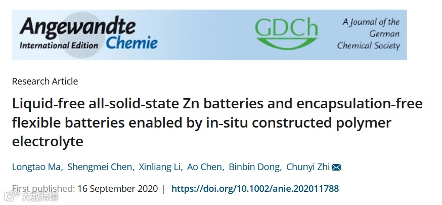 近日,香港城市大学支春义教授,在国际顶级期刊Angewandte Chemie international Edition上发表题为“Liquid‐free all‐solid‐state Zn batteries and encapsulation‐free flexible batteries enabled by in‐situ constructed polymer electrolyte”的研究工作。