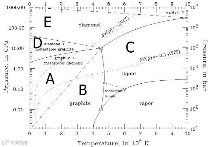 根据碳的相图,在常温常压条件下石墨是热力学稳定的相,当压力增加至超过GPa级时,金刚石才成为热力学稳定的相。另外,我们可以看到,当改变压强和温度,金刚石和石墨可以相互转化,即碳的2种不同相之间的转化。实际上,天然金刚石就是在地幔的高温高压缺氧环境中形成的。