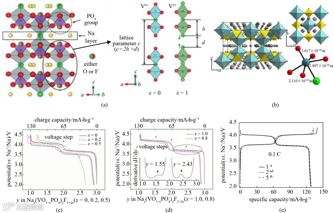 图6 (a) Na3(VO1-xPO4)2F1+2x (0≤x≤1)的晶体结构;(b) Na3V2(PO4)2O2F的晶体结构。Na3(VO1-xPO4)2F1+2x的电压-组分曲线:(c) x=0.0(蓝色),0.2(红色)和0.5(绿色);(d)x=0.8(红色)和1.0(蓝色); (e) Na3V2(PO4)2O2F 的充放电曲线