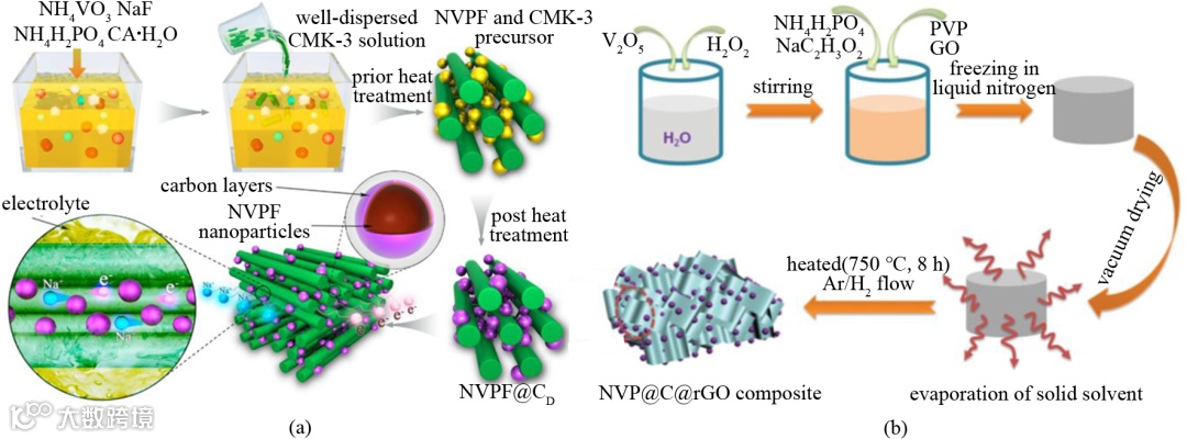 图10 (a) NVPF@CD复合物的制备过程和(b) 冷冻干燥法制备NVP@C@rGO复合物