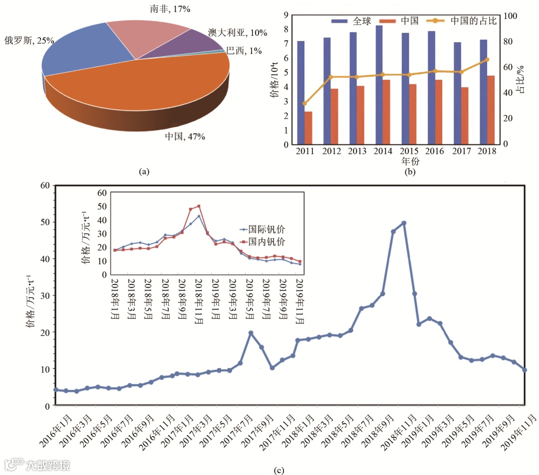 图13 (a) 世界钒矿资源分布,来源:2019世界矿产品摘要; (b) 中国钒产量及在世界的占比,来源2011—2018年世界矿产品摘要; (c) 2016—2019年钒价格波动图