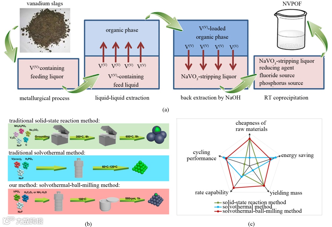 图14 (a) 萃取分离和材料制备整合;(b) 传统固相法、溶剂热法和溶剂热-球磨法;(c) 传统固相法、溶剂热法和溶剂热-球磨法的参数对比