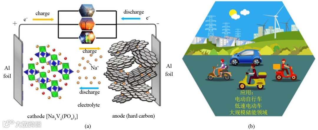 图1 室温钠离子电池的工作原理(a)和应用场景(b)