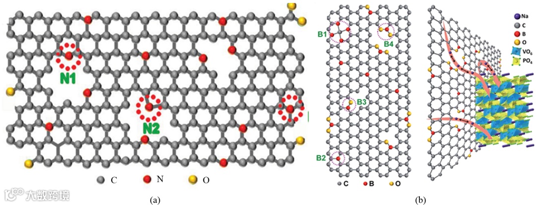 图11 (a) 碳层上N掺杂的结构,N1:吡啶N,N2:吡咯N,N3:四价N;(b) 碳层上B掺杂的结构和B掺杂碳层的钠离子扩散路径