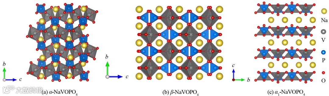 NaVOPO4拥有3种晶体结构:单斜晶系的α相(空间群:P21/c)、正交晶系的β相(空间群:Pnma)、四方晶系的α1相。如图3所示,α-NaVOPO4中的[VO6]六面体通过角相连的方式沿着c轴无限连接成链状,链与链的连接则是依靠[PO4]四面体;β-NaVOPO4中的[VO6]六面体链沿着a轴无限连接;α1-NaVOPO4具有典型的层状结构,其中VOPO4层沿着c轴的方向进行堆叠,Na+位于层间。Goodenough等首次将α-NaVOPO4应用于钠离子电池,其在充放电过程中发生1个钠离子脱/嵌,反应活性电对为V4+/V5+,属于两相反应;对应的钠脱嵌电压约为4 V,理论比容量为145 mA·h/g。β-NaVOPO4的电压为3.3 V,氧化还原反应电对为V5+/V4+,理论比容量也是145 mA·h/g。β-NaVOPO4的同构物KVOPO4,由于其独特的晶体结构([VO6]六面体和[PO4]四面体通过角相连的方式形成的正交晶相),能够实现多电子转移,发生V3+/V5+的电化学反应,理论比容量为235 mA·h/g,结合其2.56 V的平均电压,其能量密度有望实现600 W·h/kg。理论计算预测,α1-NaVOPO4由于其层状结构而在3种晶型中拥有的最快的Na扩散速率,在钠离子电池正极材料中具有潜在的应用价值,但该理论预测仍需进一步的电化学实验验证。