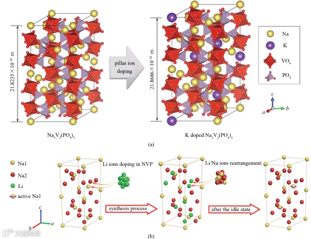 图9 (a) K掺杂Na3V2(PO4)3;(b) Na3-xLixV2(PO4)3中Li离子掺杂和重排机理