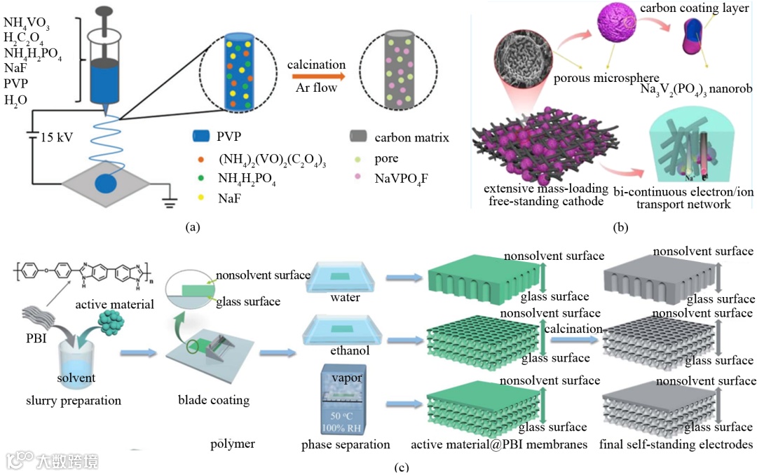 晶体结构调控和碳复合主要是保证离子和电子在电极本体材料上的快速传导,要想实现电子和离子在整个电池中的快速连续传导,就需要从介观尺度上对整个电极结构进行科学设计。构建具有连续三维多孔结构的电极能够有效提升电子和离子在整个电极上的传导,从而提升电极材料的电化学性能。目前用于制备这种连续的三维多孔电极的常用方法包括静电纺丝法、铸膜法、相转化法、抽滤法等。这些方法制备出来的多属于自支撑电极,无需集流体,不仅能提升电荷传导能力,还能在电池层面上提升能量密度。