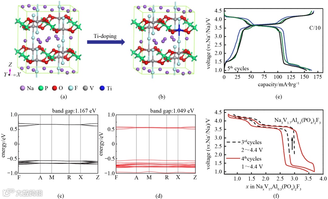 图8 Na3V2(PO4)2F3(a)和Ti掺杂Na3V2(PO4)2F3(b)的晶体结构模型;Na3V2(PO4)2F3(c)和Ti掺杂Na3V2(PO4)2F3(d)的能带结构;(e) Na3V2-zAlz(PO4)2F3的充放电曲线;(f) Na3V1.7Al0.3(PO4)2F3的电压-钠含量图