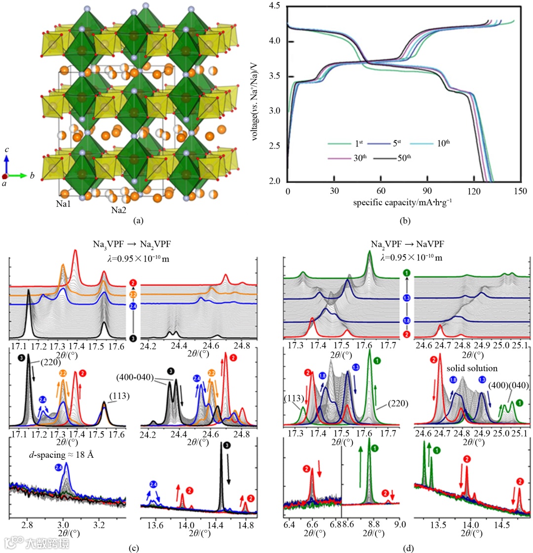 注: (c)~(d) Na3V2(PO4)2F3的原位SXRD图
