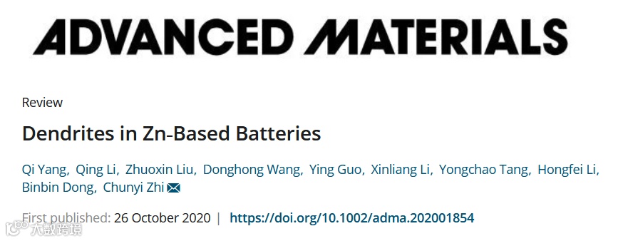 近日,香港城市大学支春义教授等合作。在国际顶级期刊 Advanced Materials(影响因子:25.809) 上发表题为“Dendrites in Zn‐Based Batteries”的研究工作。