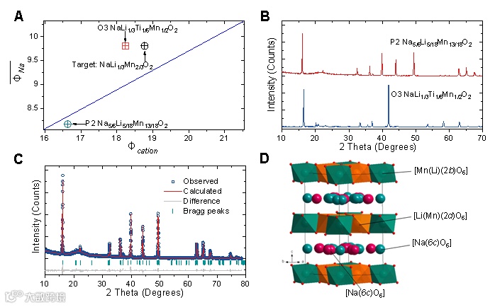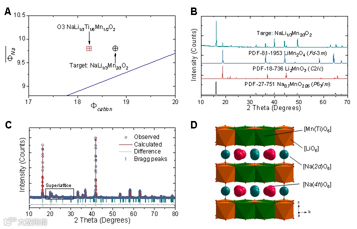 图2 根据阳离子势设计富钠O3材料。(A)Na-Li-Mn(Ti)-O的阳离子势分析;(B)初始组成Na[Li1/3Mn2/3]O2的XRD图谱和相关标准图谱;(C)O3-Na[Li1/3Ti1/6Mn1/2]O2的结构精修XRD图谱;(D)[Li1/3Ti1/6Mn1/2]O2层中Li/Mn(Ti)有序排布的结构示意图。