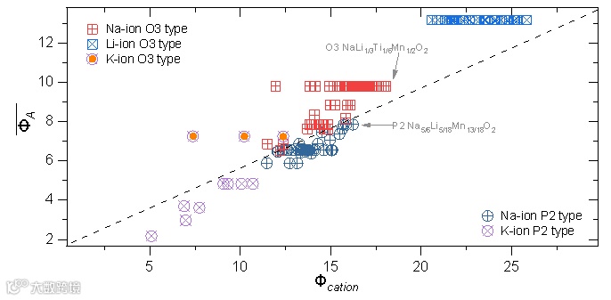 通过将阳离子势和碱金属的加权平均离子势绘制“相图”发现该方法同样适用于锂离子和钾离子层状氧化物结构材料。由于从K+到Na+再到Li+表现出了增大的离子势,即能对过渡金属层产生更大的静电屏蔽作用,结果导致钾离子层状氧化物多为P2相,锂离子层状氧化物多为O3相,而钠离子由于其中等的屏蔽能力可以同时形成P2相和O3相结构。