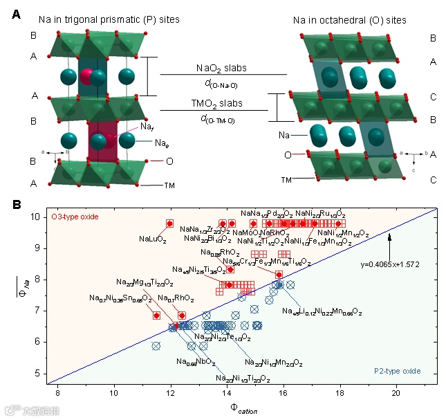 图1 阳离子势及其在钠离子层状氧化物中的应用。(A)典型P2型和O3型钠离子层状氧化物晶体结构示意图;(B)具有不同钠含量、不同过渡金属氧化态和组成的P2型和O3型钠离子层状氧化物在以阳离子势Φcation为横坐标,钠的加权平均离子势为纵坐标的直角坐标系中的分布图。