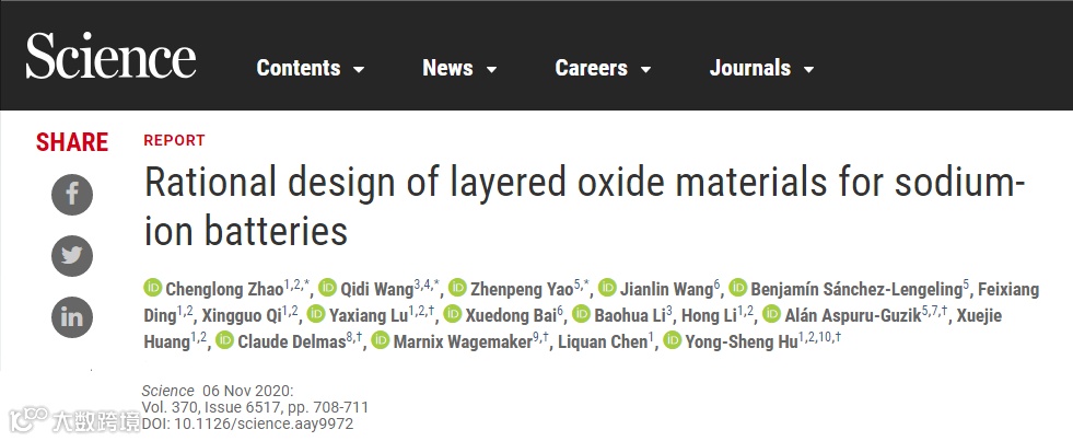 相关成果以“Rational design of layered oxide materials for sodium-ion batteries”为题发表在Science杂志上。