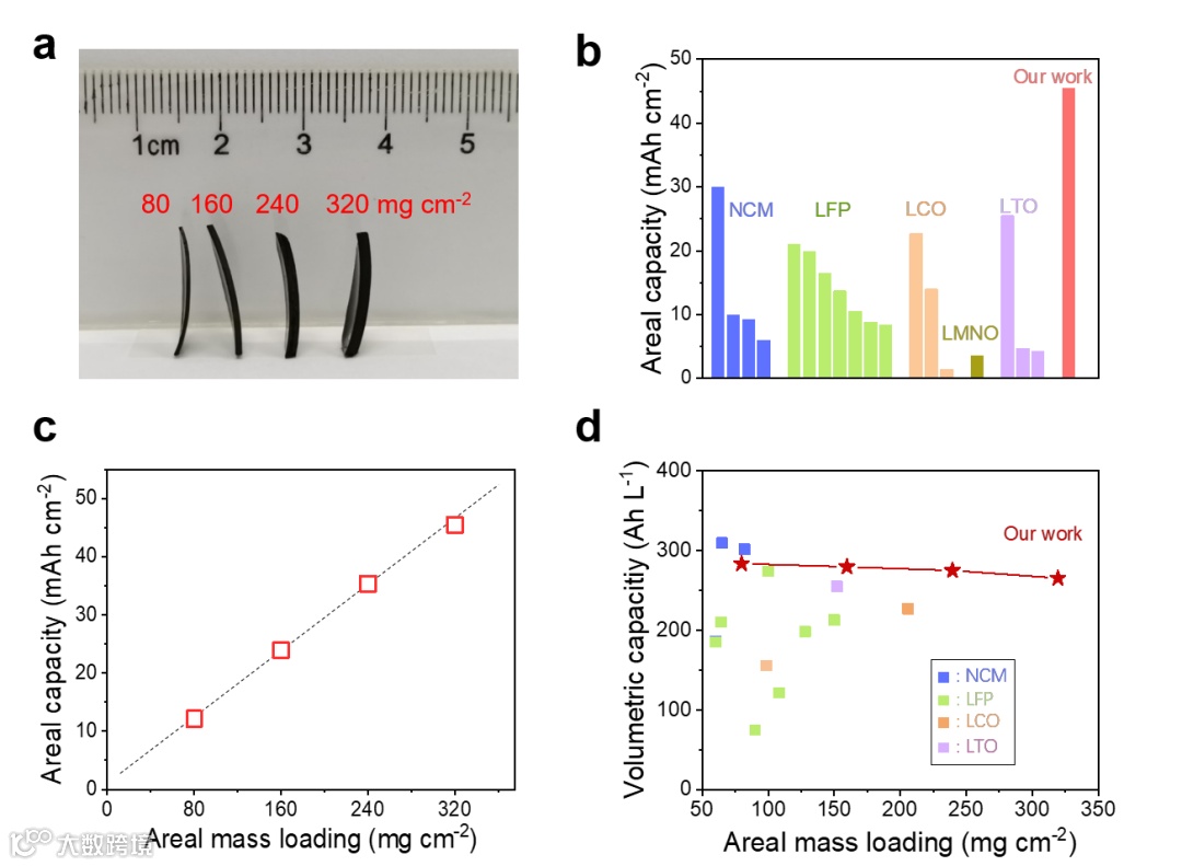 本文实现超厚电极的构建,面积负载量最高达320 mg/cm2。随着负载量的增加,离子传输通道始终畅通无阻,活性物质克容量无明显衰减。最终,在38%的孔隙率下,最高面积容量达45.4mAh/cm2。