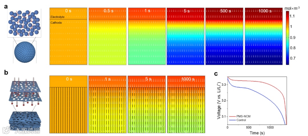 直到500s后浓度梯度才趋于稳定,直到此时,电化学反应消耗的锂离子与扩散补充的锂离子才达到平衡。而在二维多孔片中,离子扩散非常顺畅,体系在5秒内迅速达到平衡,并保持一个低的、稳定的浓度梯度。同时,因为更小的电极极化,电极的放电平台也要优于传统电极。