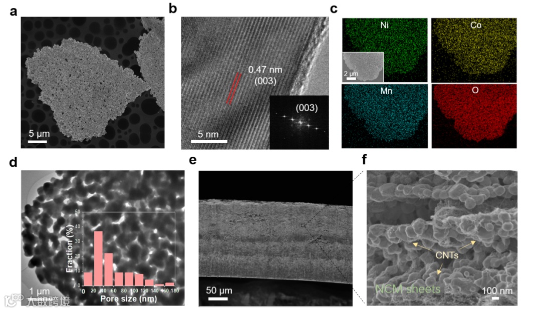 本文提出了多种二维多孔片的通用制备策略,以主流正极材料三元镍钴锰为例,利用葡萄糖辅助的方法,合成二维多孔片,与碳管共混后层层组装成膜,得到自支撑电极片。