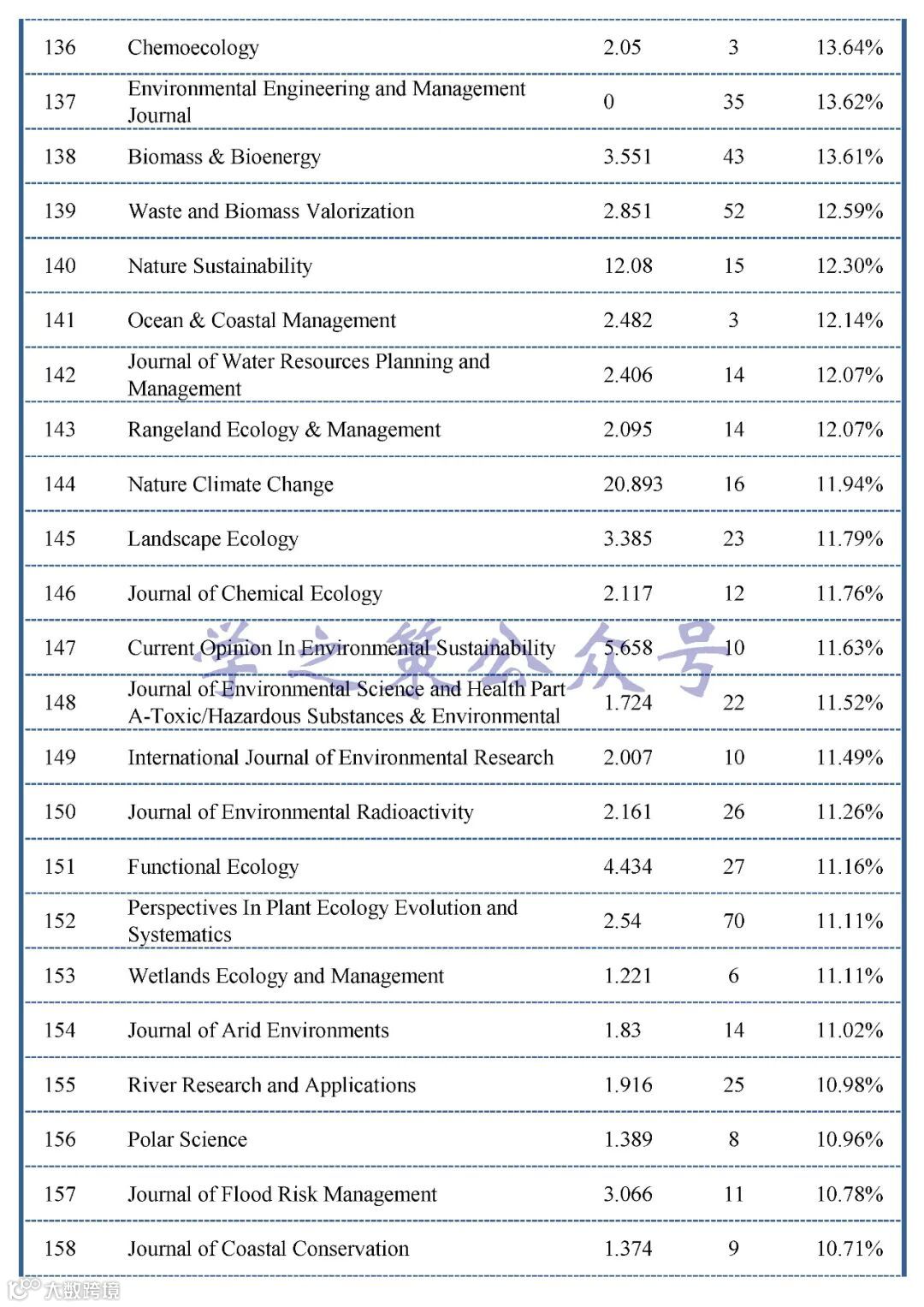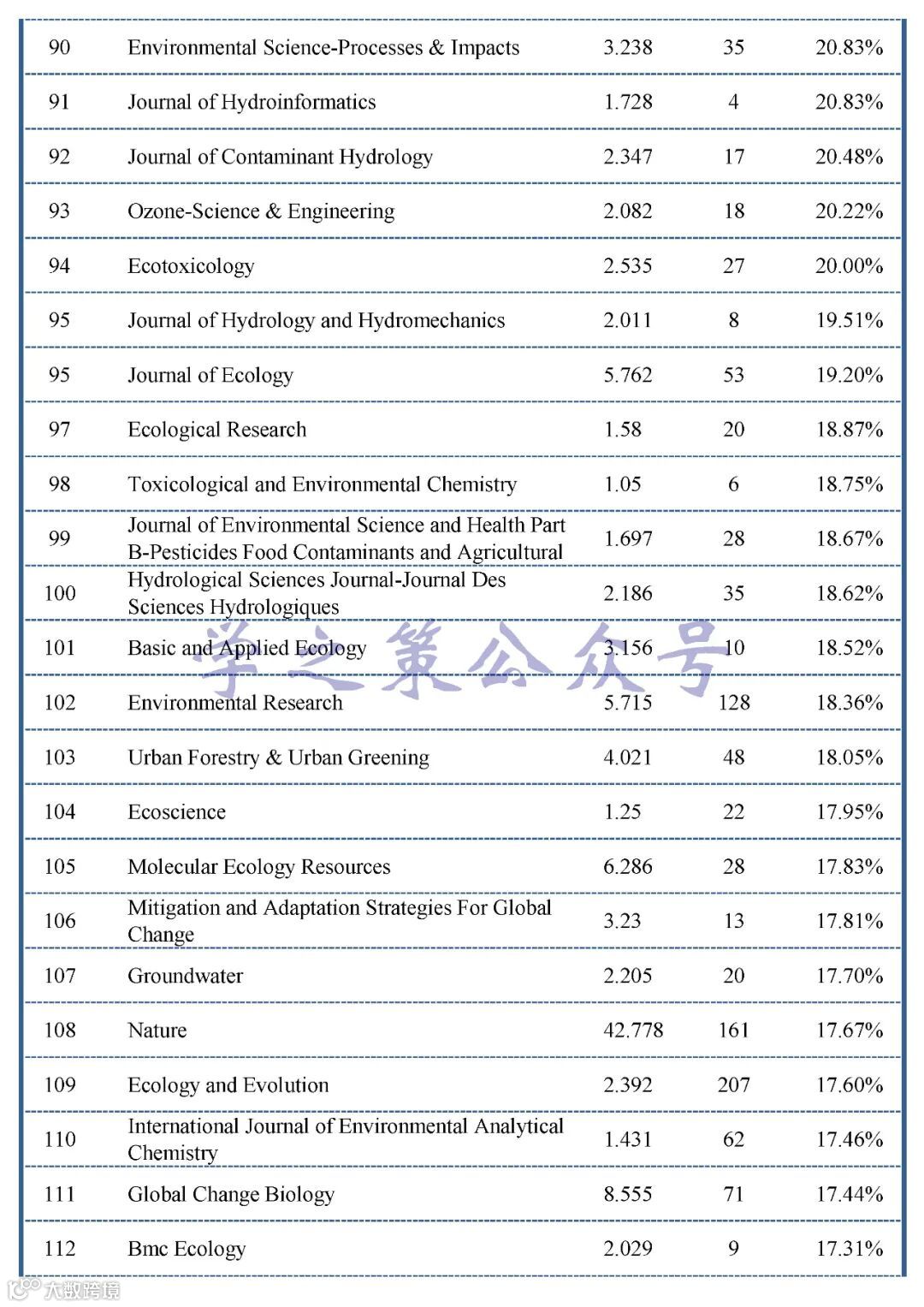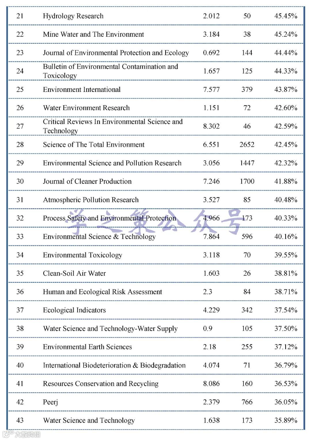 国人比较关注的一些1区环境期刊,国人发文占比基本在40%-50%之间,例如ES&T为40.16%,WR为46.91%,JCLP为41.88%,STOTEN为42.45%。JHM比较高,超过了50%,为56.42%。
