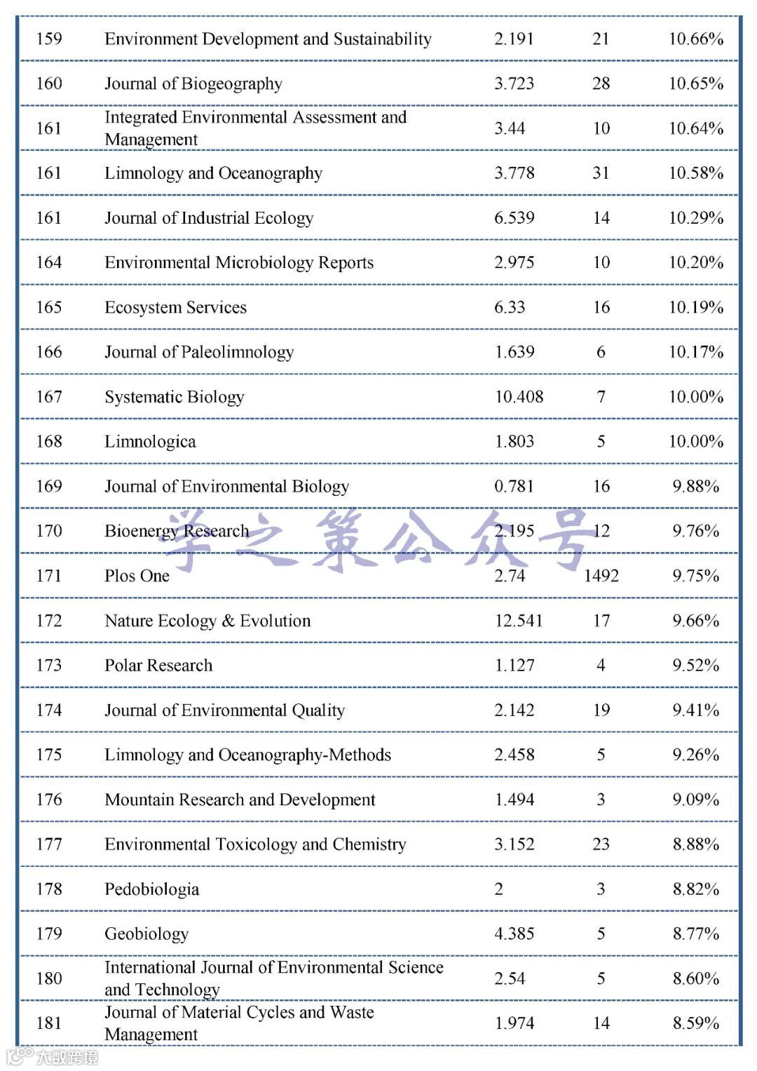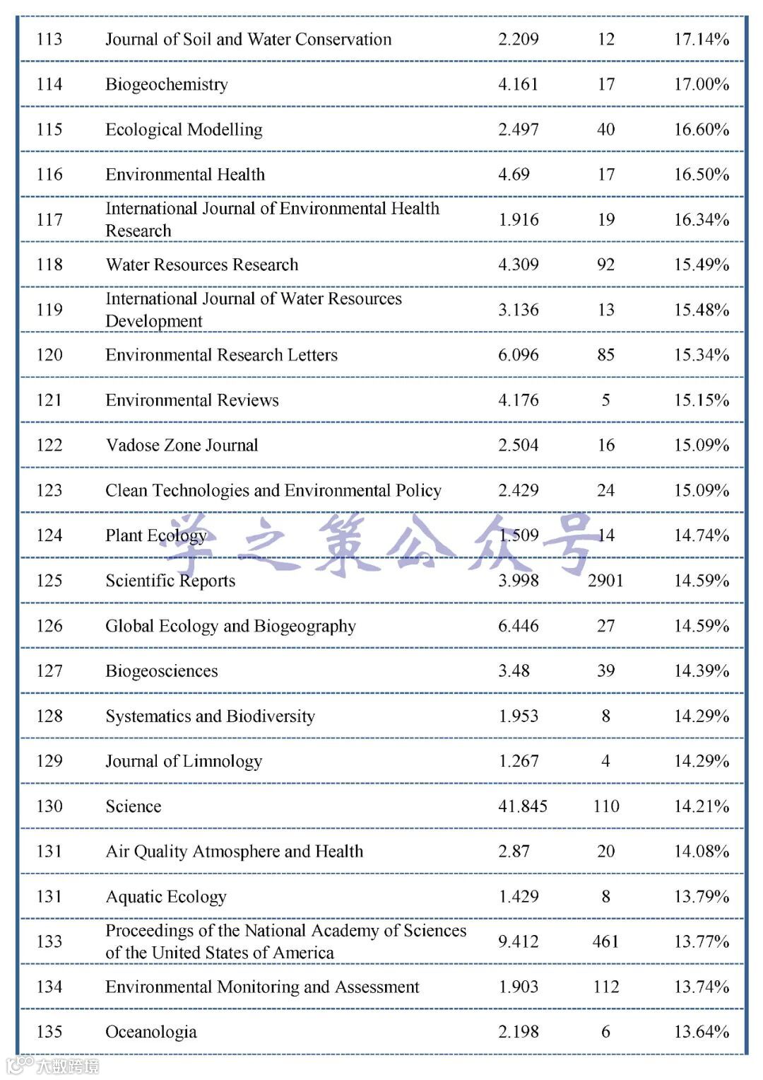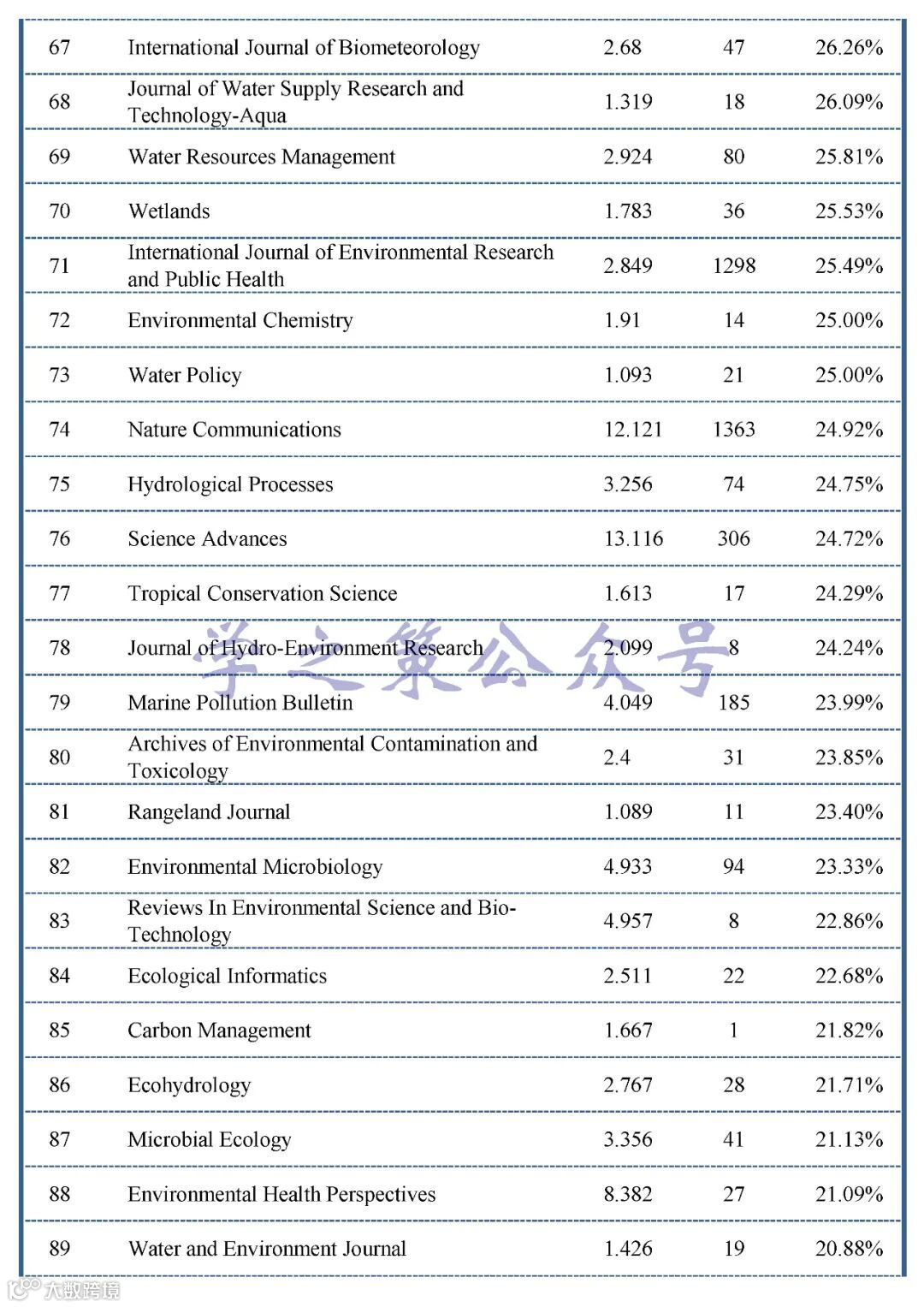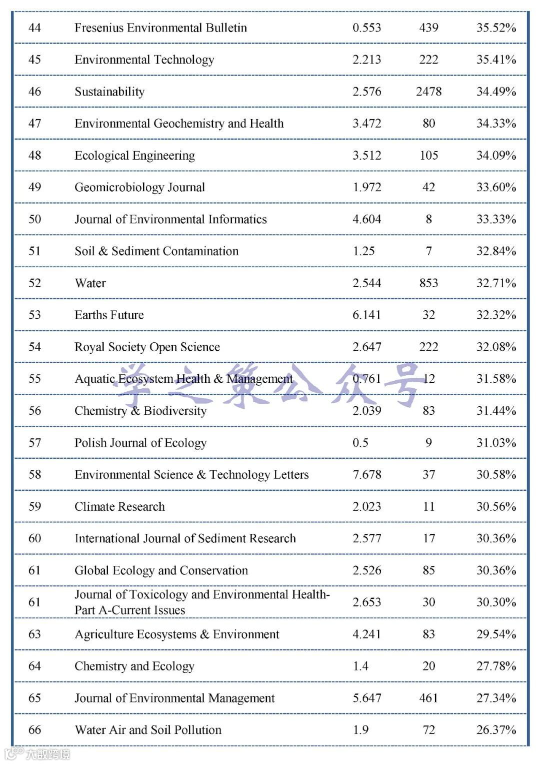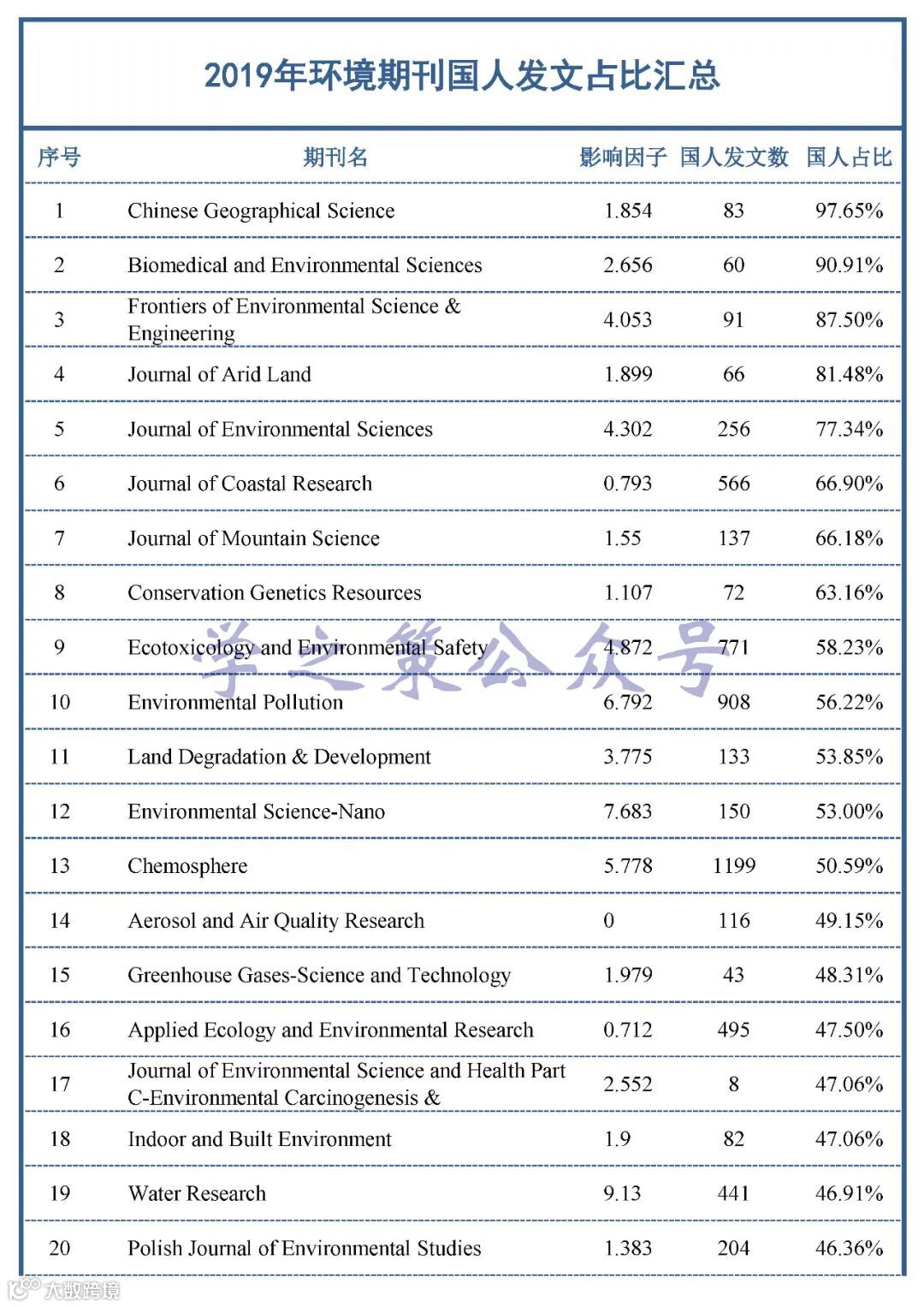 排名前5的期刊都是国产期刊,这也从侧面反映出国产期刊的国际影响力还有待加强。其中最高的是Chinese Geographical Science,国人占比达到了97.65%。Frontiers of Environmental Science & Engineering和Journal of Environmental Sciences都是环境大类的2区期刊,其中JES的稍低,为77.34%。