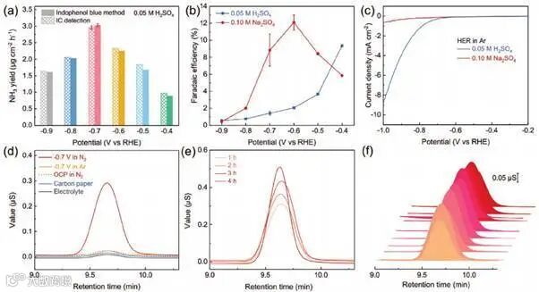 图3:0.05 M H2SO4电解液中电催化NRR性能。