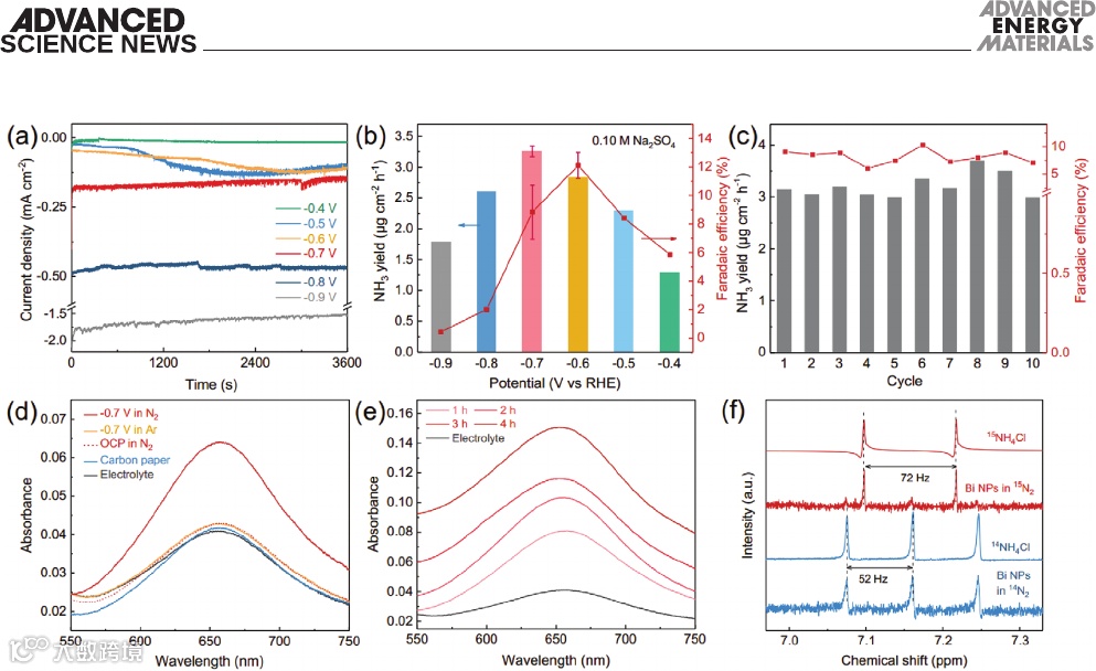 图2:0.10 M Na2SO4电解液中电催化NRR性能。